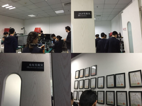 在我司展厅参观和聆听演讲及讨论的过程中,学生们不仅领略到了光固化3D打印是如何通过紫外线的照射将液态的光敏树脂固化成带有光滑细致表面的塑料产品,还领略到了我司的两种不同的光固化3D打印技术:SLA与DLP。而DLP技术让学生们联想到投影到屏幕上的投影仪与屏幕的关系,而当了解到目前的DMP技术主要是基于TI(美国德州仪器)公司开发的数字微镜元件—DMD(Digital Micromirror Device)来完成可视数字信息显示的技术,学生们普遍感到开发元器件对我国的重要性。
