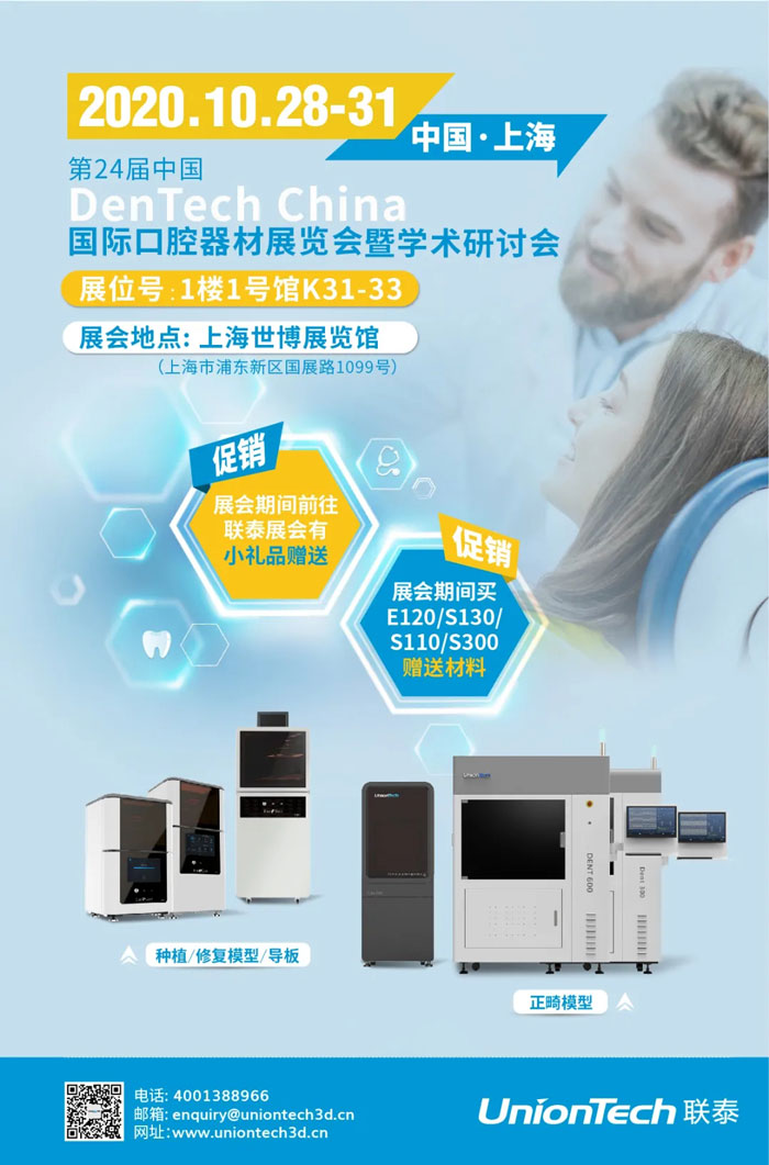 “DenTech China 2020 第24届中国国际口腔器材展览会暨学术研讨会“是由中国国际科技交流中心、上海交通大学医学院附属第九人民医院和上海博星展览有限公司共同举办,将于2020年10月28日至10月31日在上海世博展览馆举行。展会逾50,000平方米展览面积,来自世界25个国家和地区的850家展商入驻,感受前沿的牙科技术,享受优质的一站式服务。同期学术会议,计划邀请到约200位演讲嘉宾,就行业的热点话题及面临的具体问题展开演讲。